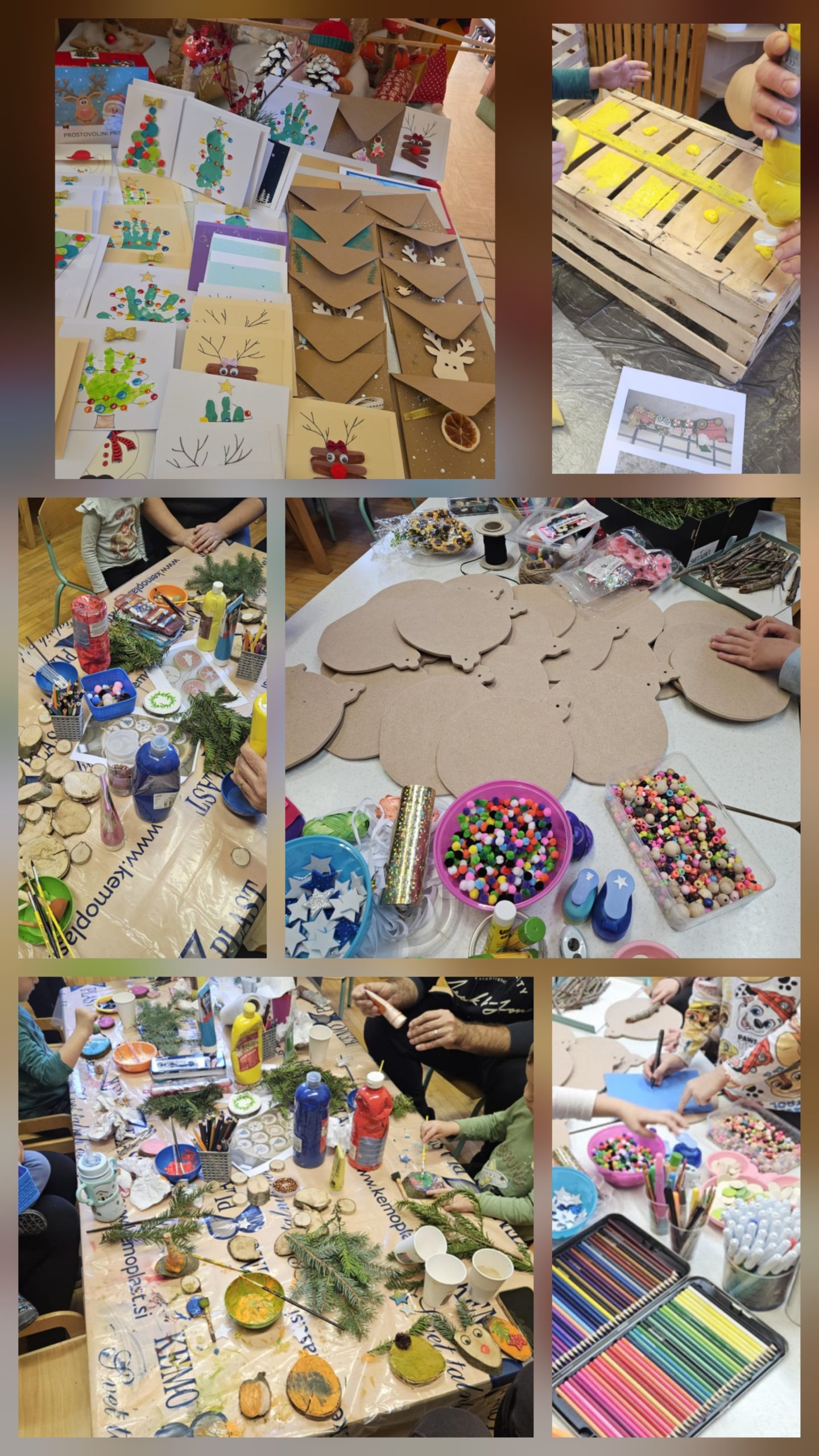 V četrtek, 27. 11. 2025, smo v vrtcu izvedli božično-novoletno delavnico s starši. Skupaj so lahko izbirali med tremi ustvarjalnimi delavnicami. V prvi delavnici so izdelovali božični vlakec iz zabojnikov, v drugi so iz lesenih krogov ustvarjali okraske za smrečico, v tretji pa božične lesene okraske. Starši so lahko vzeli tudi praznične voščilnice, za prejete prostovoljne prispevke pa se jim iskreno zahvaljujemo.